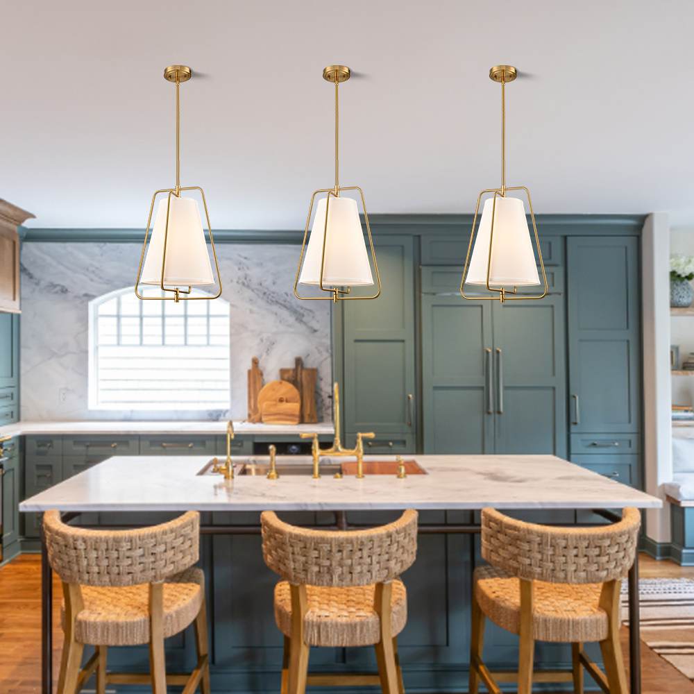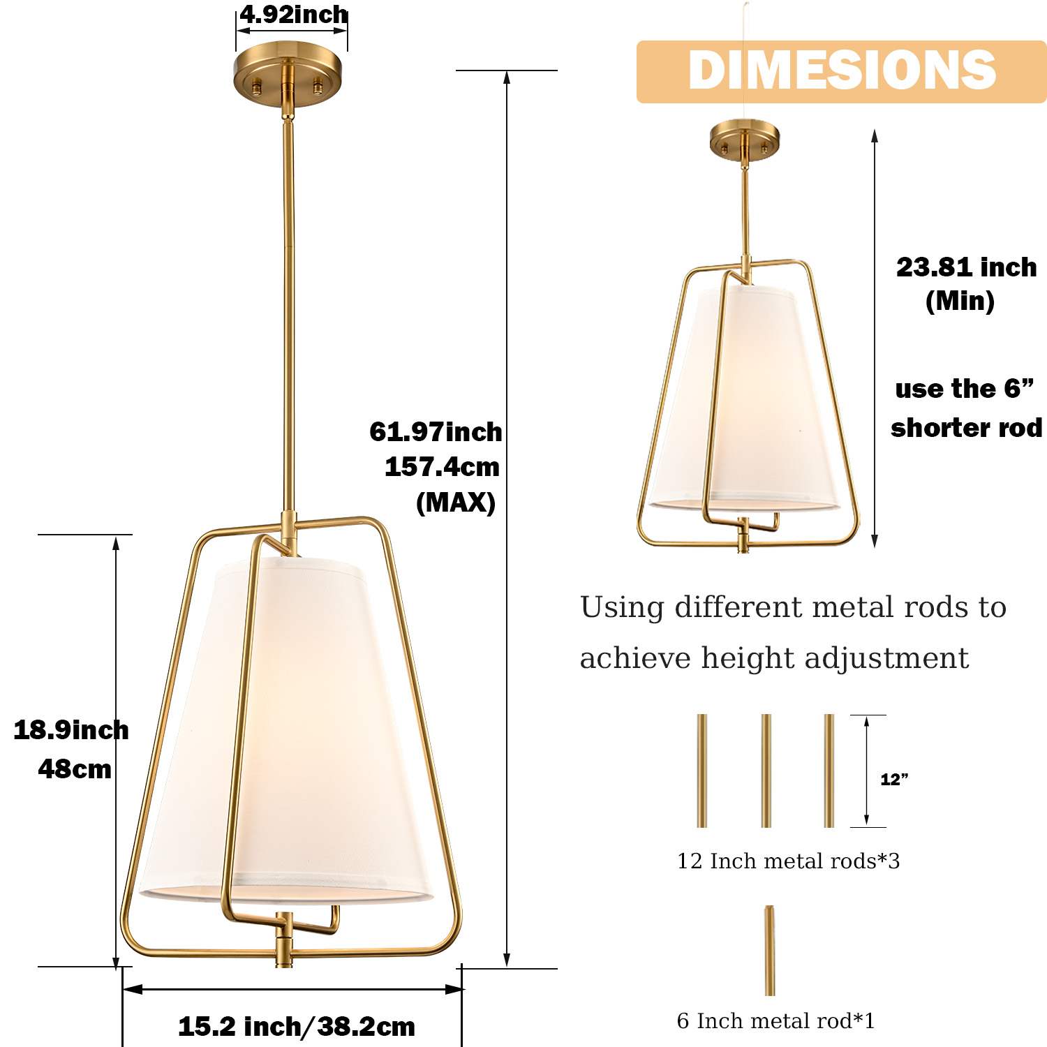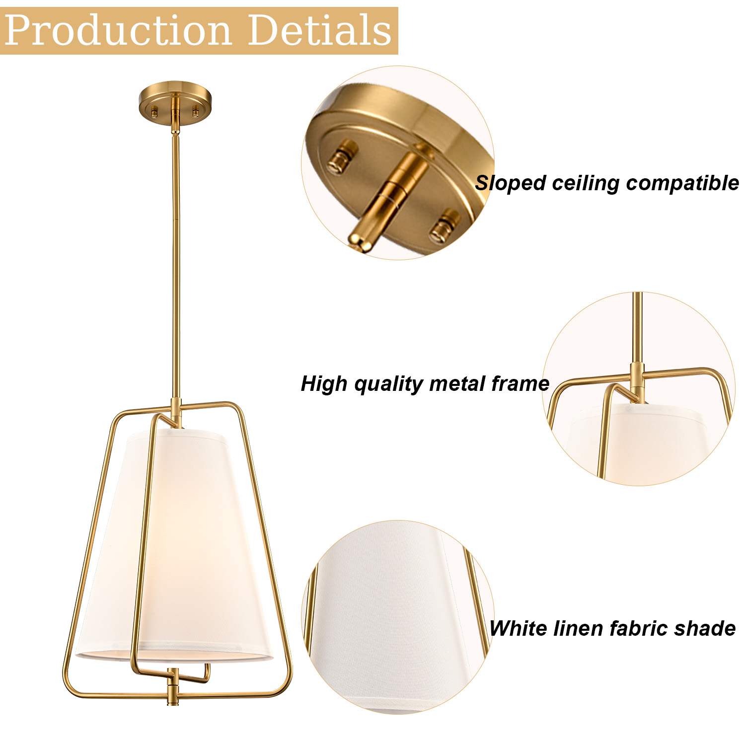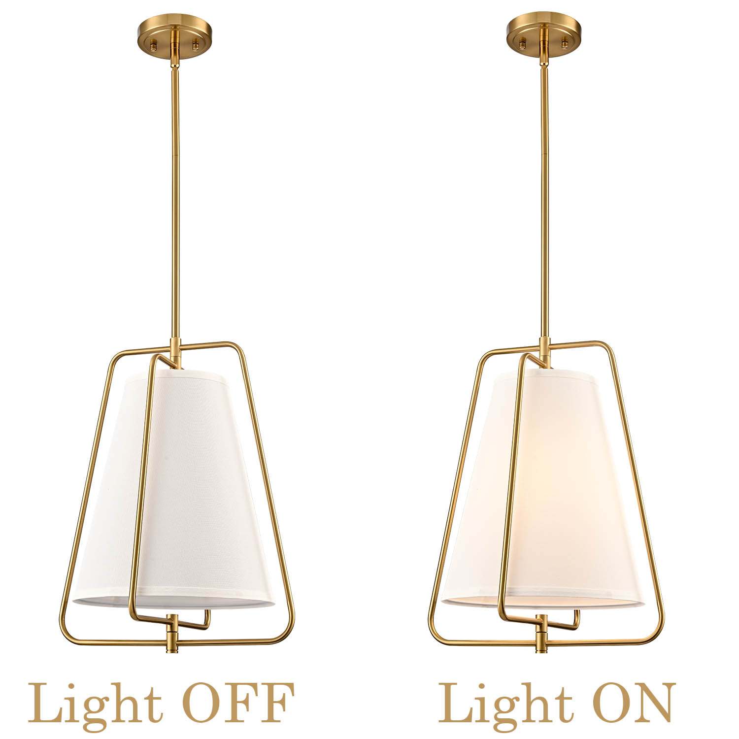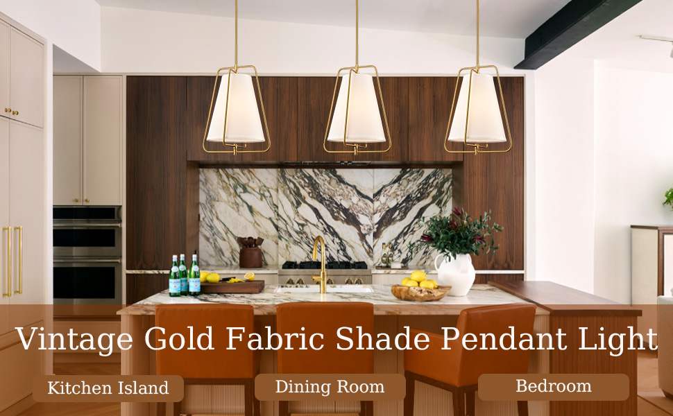 The vintage gold pendant light flaunts a rustproof antique gold finish, pepping up your living space with a boost of brightness. Its white linen cone shade is held aloft by an intersecting gold metal frame which brings rich visual interest to your interior. The light pouring through the linen cone shade is gently muted and fills the room without any glare. Its rounded cone shade gives your home a touch of geometry. Its gold finish contrasts the white linen shade and adds a ton of eye appeal to the space.