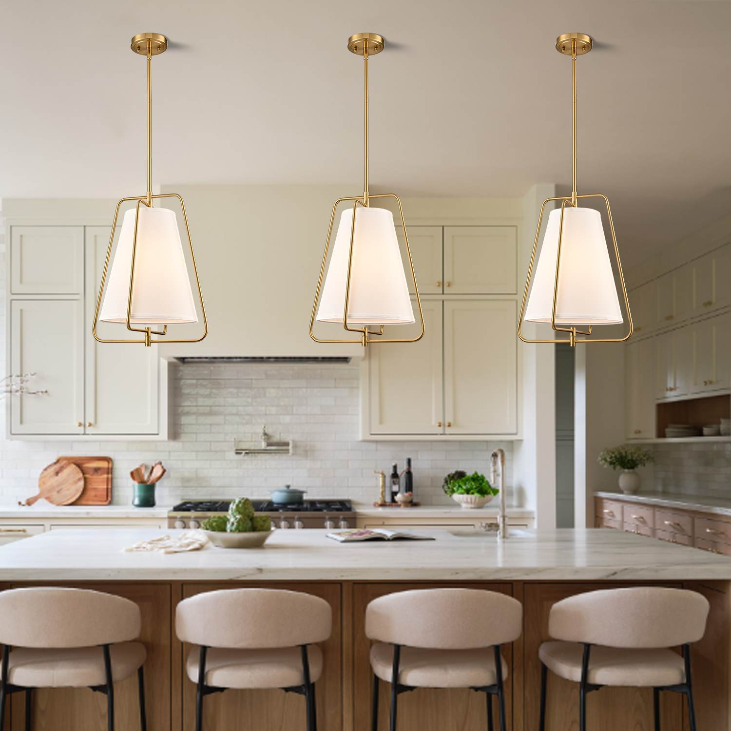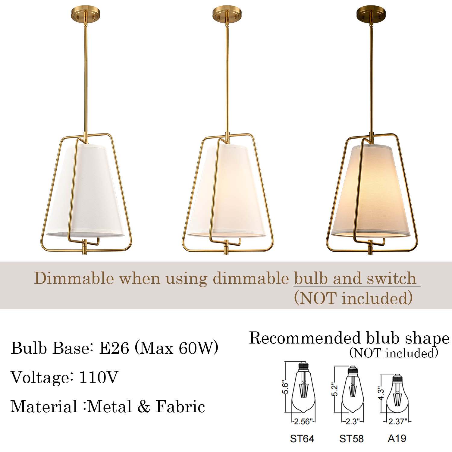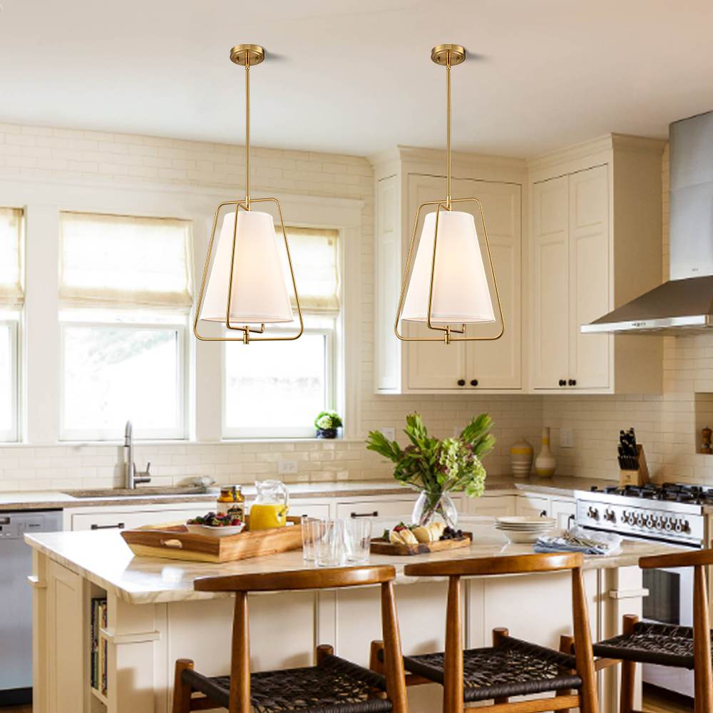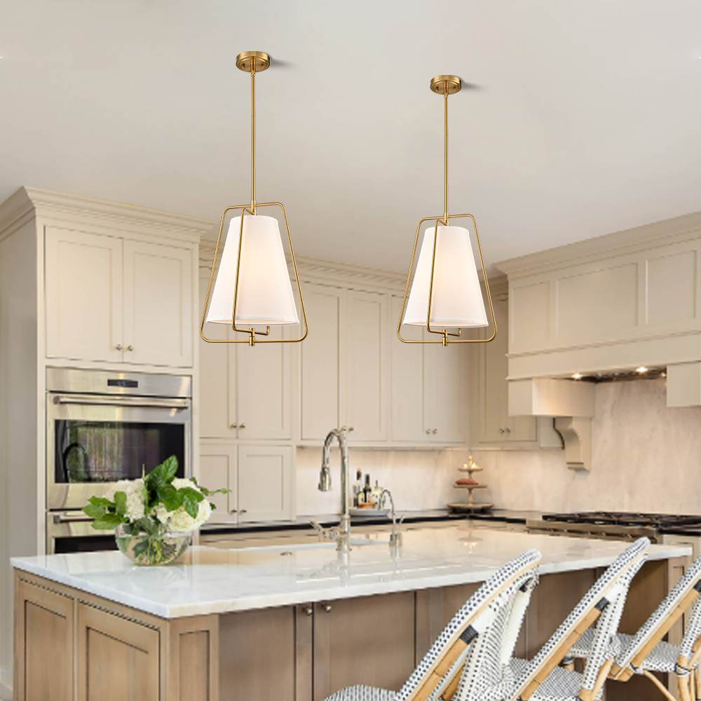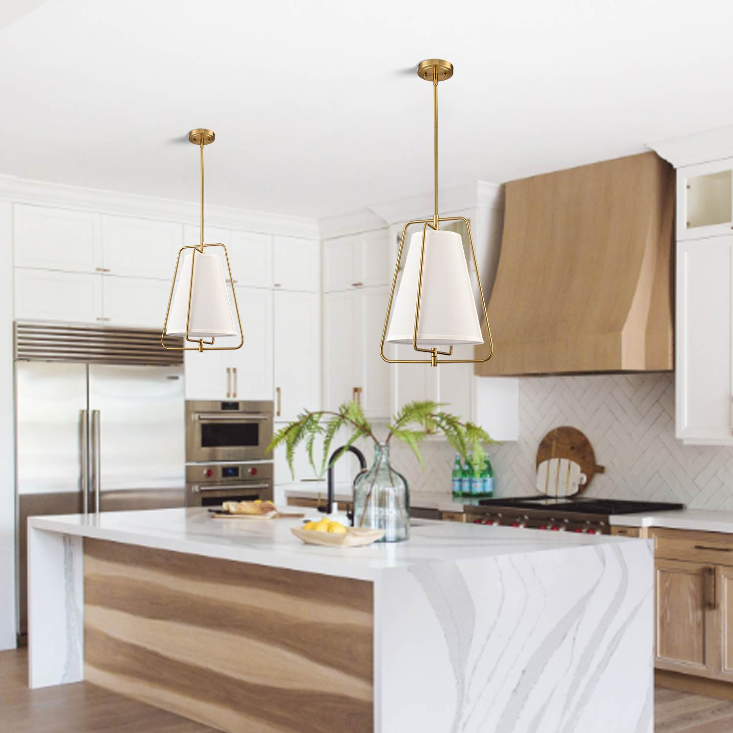 The vintage gold pendant light flaunts a rustproof antique gold finish, pepping up your living space with a boost of brightness. Its white linen cone shade is held aloft by an intersecting gold metal frame which brings rich visual interest to your interior. The light pouring through the linen cone shade is gently muted and fills the room without any glare. Its rounded cone shade gives your home a touch of geometry. Its gold finish contrasts the white linen shade and adds a ton of eye appeal to the space.