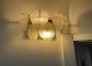 The vintage wall light flaunts a brass finish, bringing a dash of metallic glitz to your living space. Seven frosted glass leaves are arranged in two tiers with four on the top tier and three on the lower tier for layers of sparkling style and a touch of luxury. A white bead garland is hung from the nuts attached to the glass leaves and elegantly dangles from the top tier. Its white bead garland contrasts and competes with the brass metal frame and the glass leaves, making for a glamorous play on materials. Two tiers of frosted glass leaves form an airy shade and encircle two exposed bulbs in the middle.