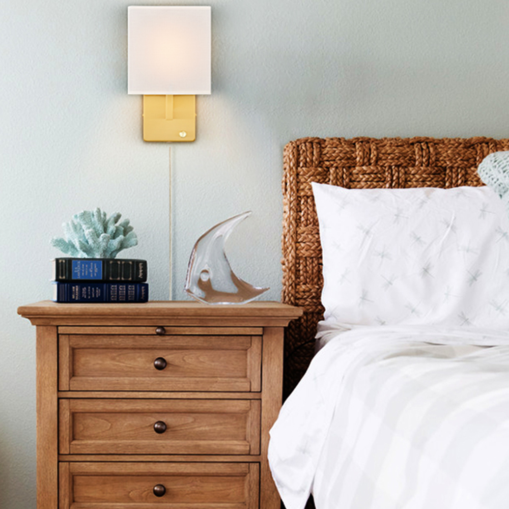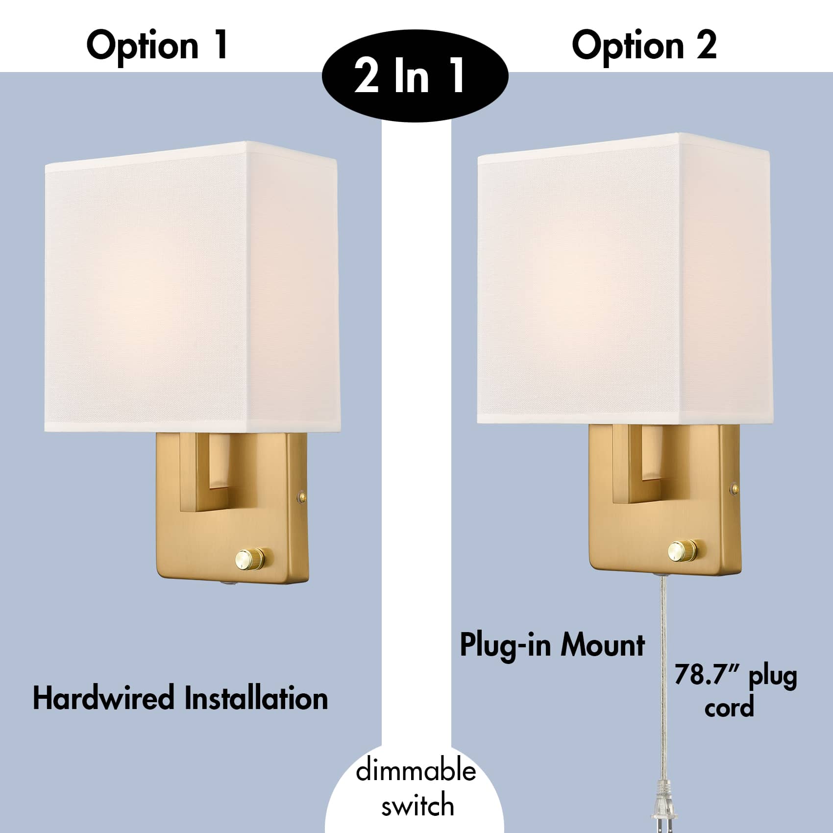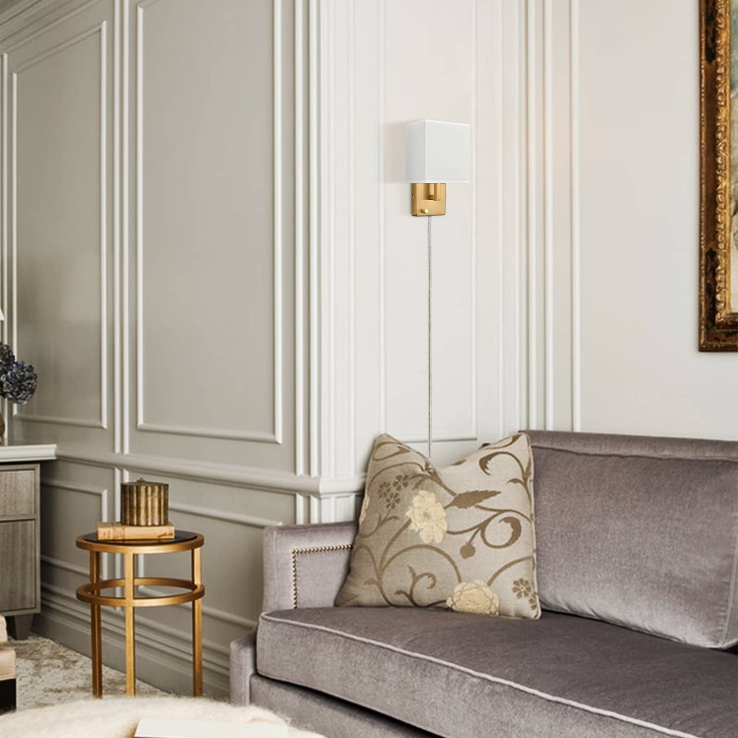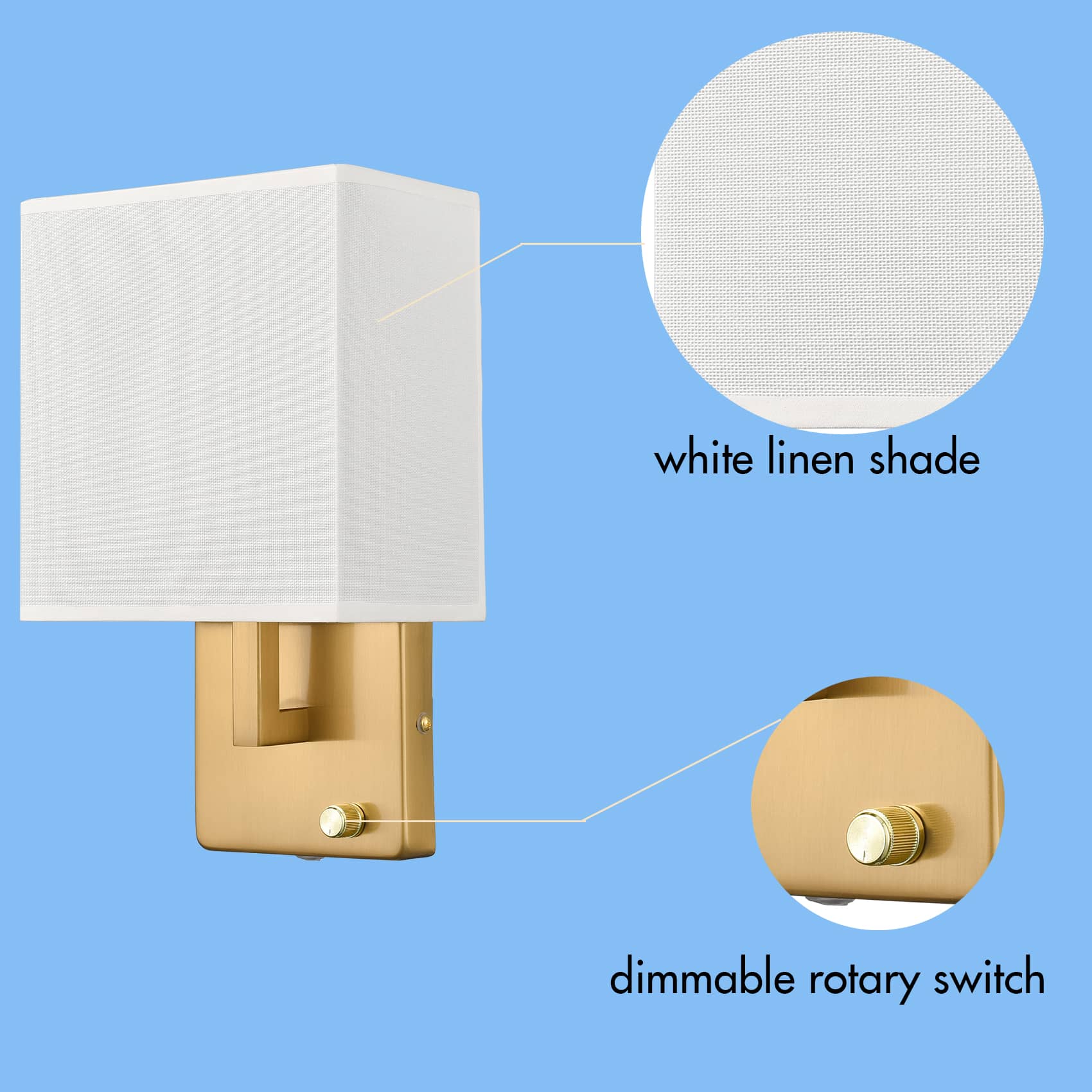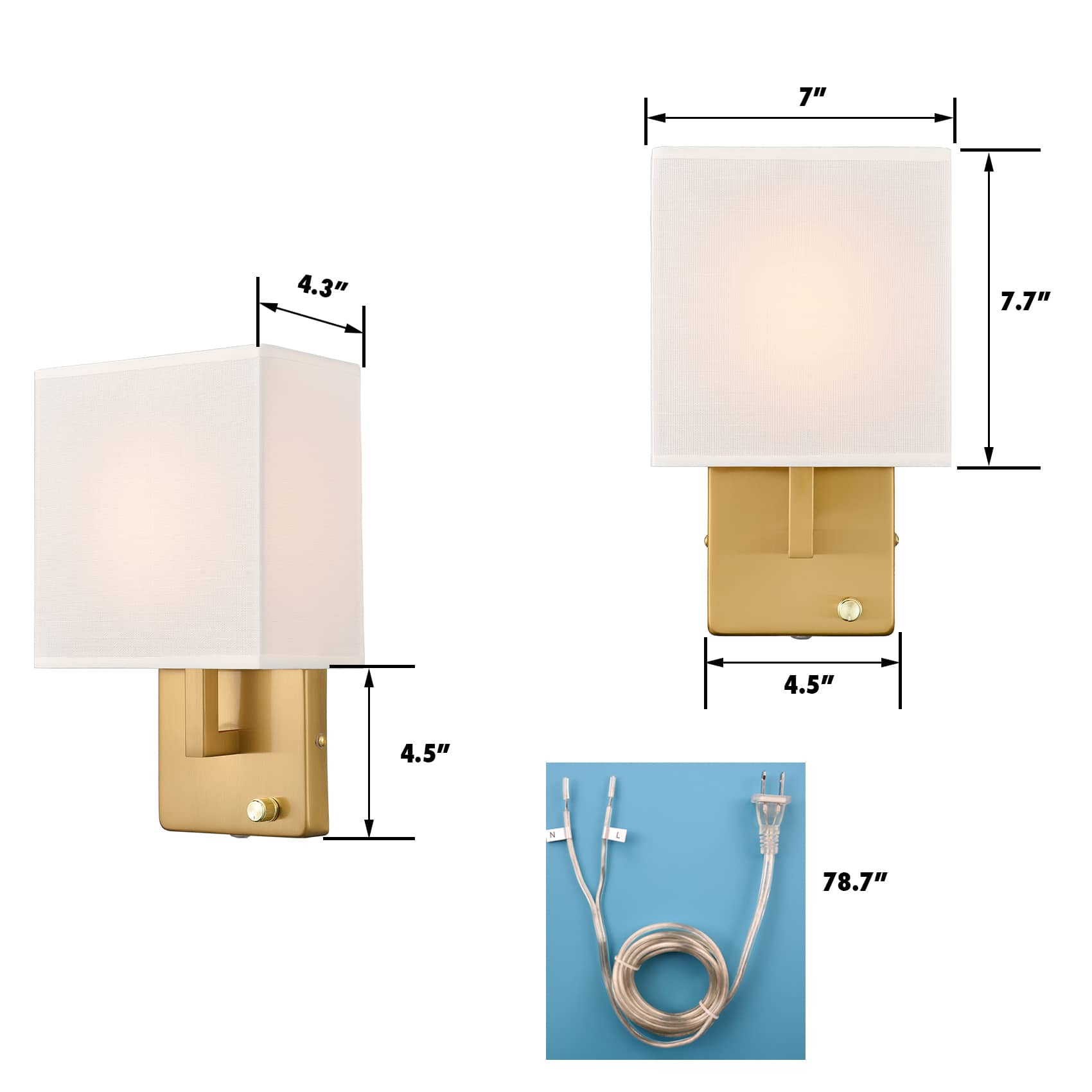 The modern plug-in wall sconces' canopies, arms, and lamp holders boast a rustproof electrophoretic brass finish, perking up your interior with a touch of shimmer. Sporting the covered edge workmanship, their white linen rectangular lampshades complete the aesthetic with a large dose of texture. The square canopies and rectangular lampshades showcase the beauty of geometry and convey a refined touch. The light pouring through the fabric lampshades is gently muted and fills the room without any glare. Their white linen lampshades contrast the brass finish and add alluring visual interest to the space. Each wall sconce comes with a 78.7-inch plug-in cord. The switch on their canopies is both an on/off switch and a dimmer switch.
