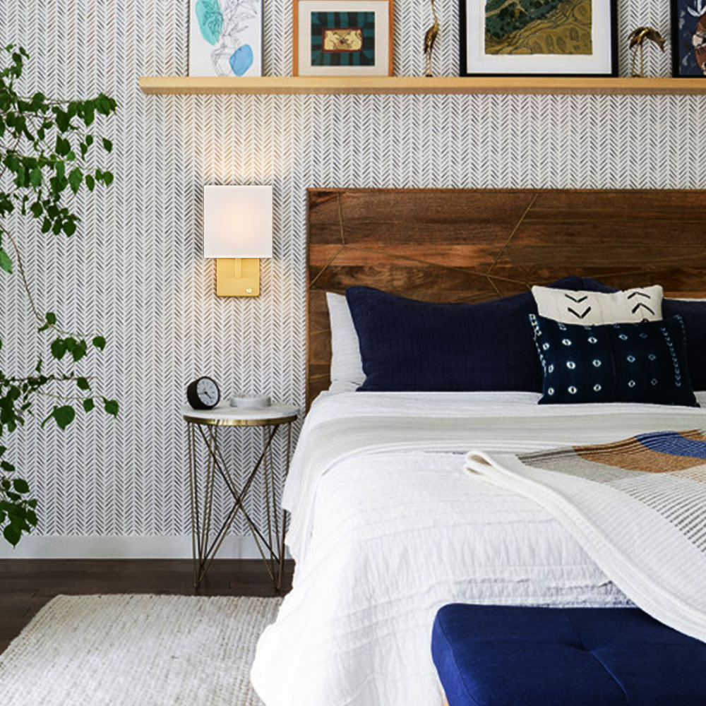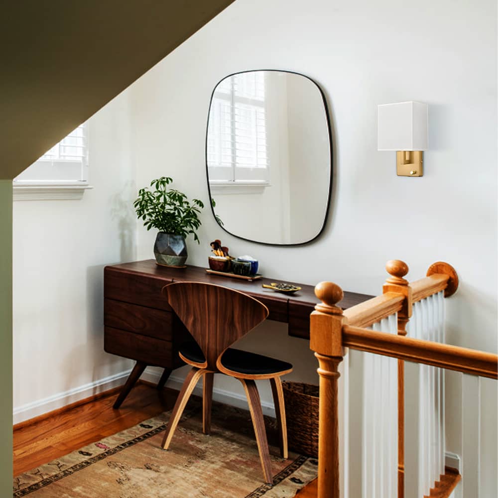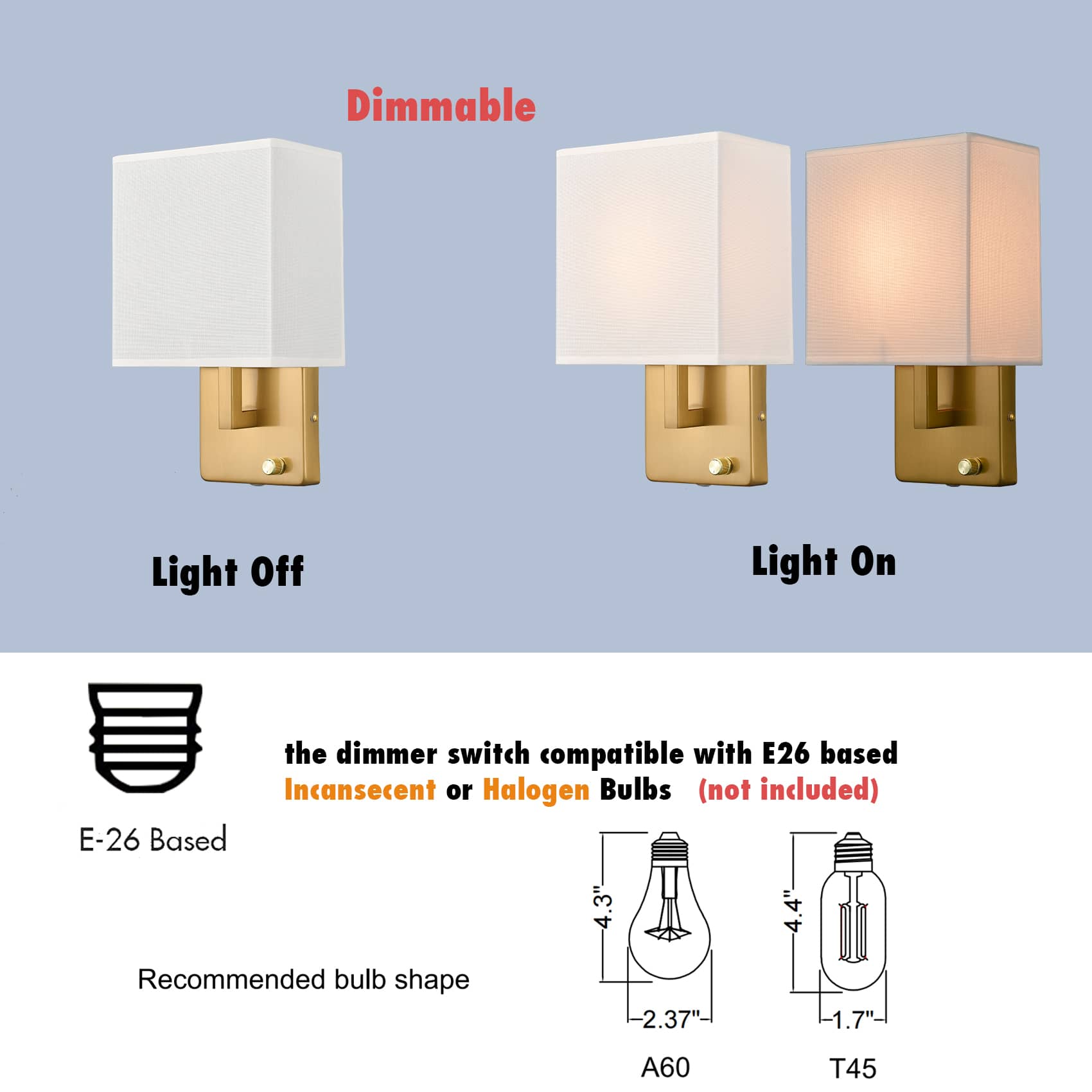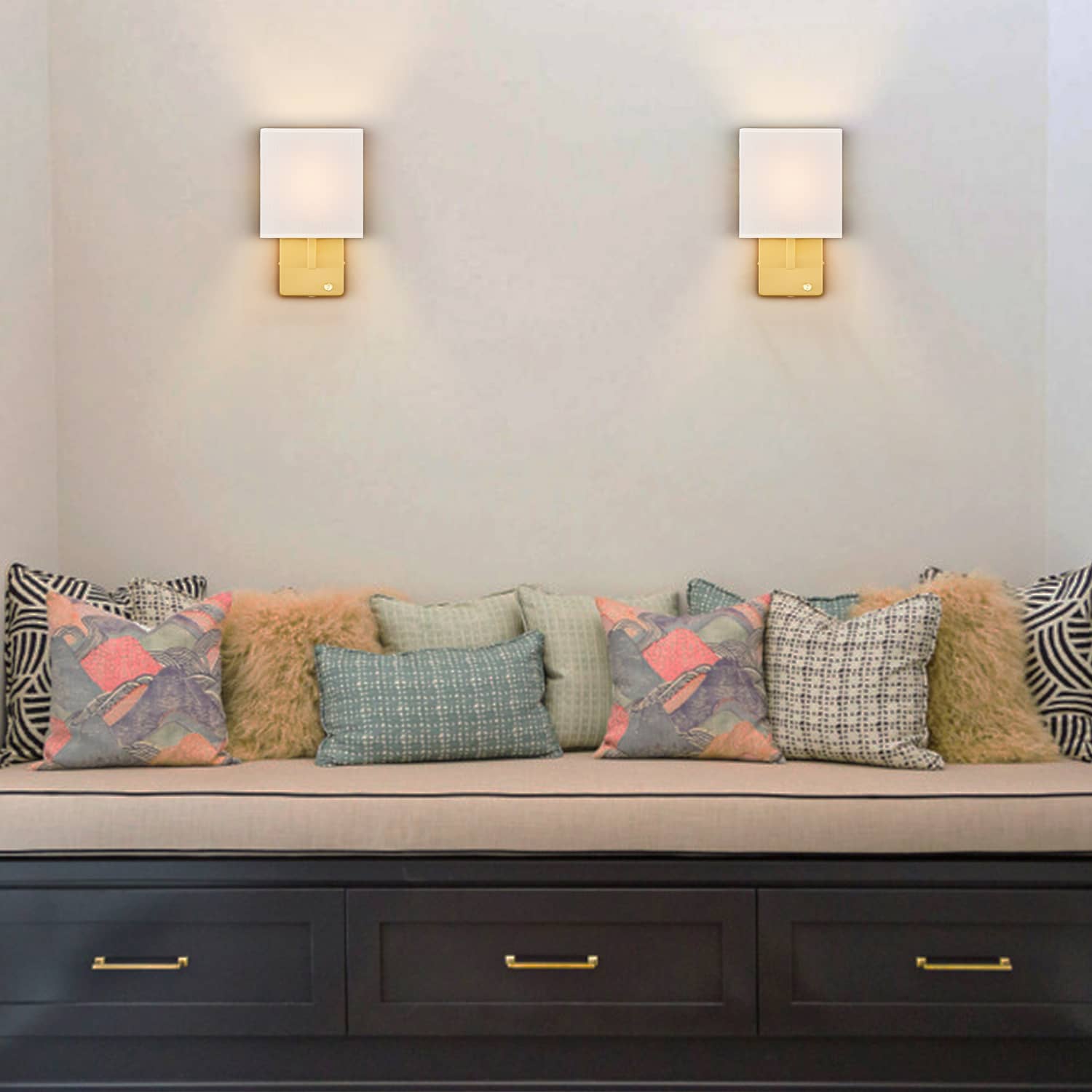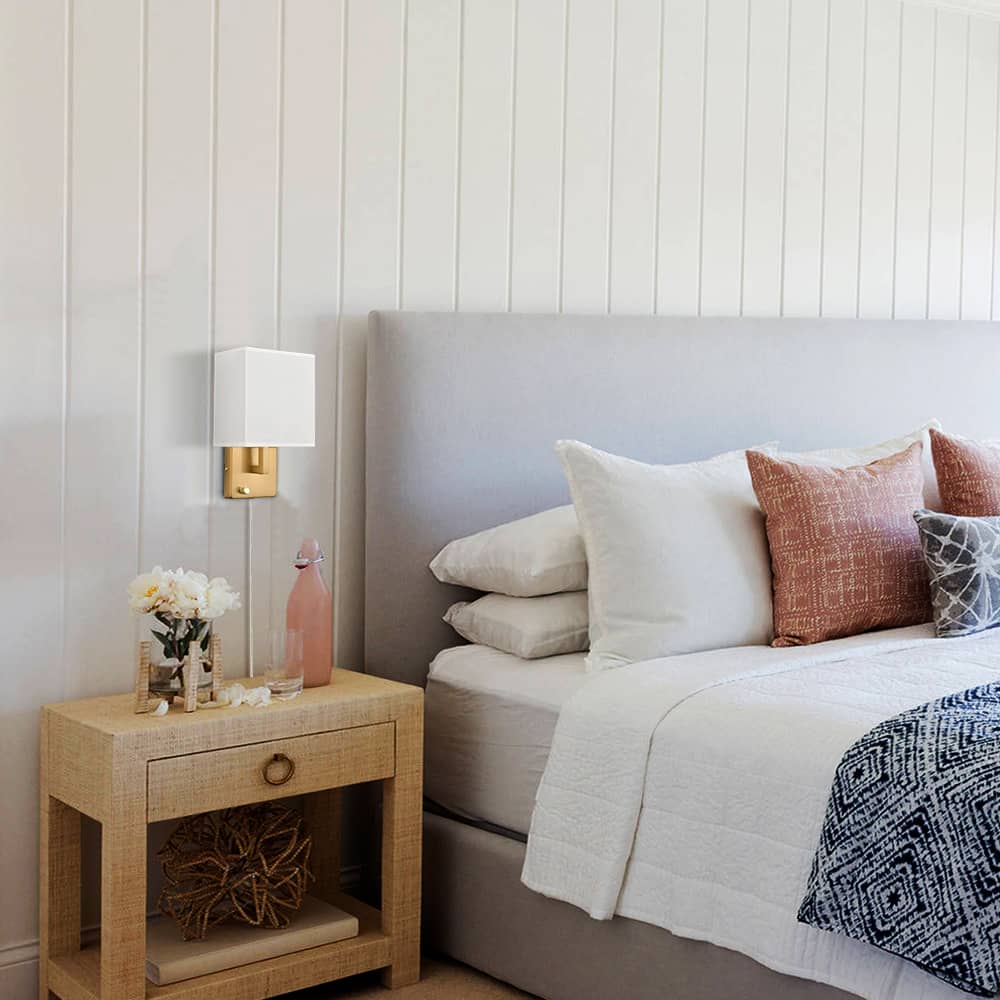 The modern plug-in wall sconces' canopies, arms, and lamp holders boast a rustproof electrophoretic brass finish, perking up your interior with a touch of shimmer. Sporting the covered edge workmanship, their white linen rectangular lampshades complete the aesthetic with a large dose of texture. The square canopies and rectangular lampshades showcase the beauty of geometry and convey a refined touch. The light pouring through the fabric lampshades is gently muted and fills the room without any glare. Their white linen lampshades contrast the brass finish and add alluring visual interest to the space. Each wall sconce comes with a 78.7-inch plug-in cord. The switch on their canopies is both an on/off switch and a dimmer switch.